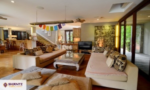 La maison principale est bâtie sur 2 étages, au rez-de-chaussée se trouve la pièce à vivre spacieuse dotée d'oeuvres d’arts, d’éléments traditionnels et d’un mobilier de qualité. Cet espace de vie commun est composé d’une salle à manger pouvant accueillir 10 personnes sur une très belle table en bois carré avec de confortables fauteuils, d’une cuisine équipée, d’un bar et de 2 salons.