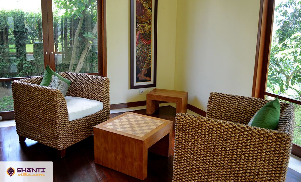 Un étang, des statues et la vue sur la propriété vous immergent dans l’ambiance zen que dégage cette villa en location à Ubud. Le premier édifice est un Bale Bengong ouvert sur l’extérieur avec une architecture typique de l’Indonésie. Il est doté d’une salle à manger pouvant accueillir jusqu’à 12 personnes sur une grande table en bois, d’un salon avec 3 canapés et une télévision ainsi que d’un espace détente avec des fauteuils.